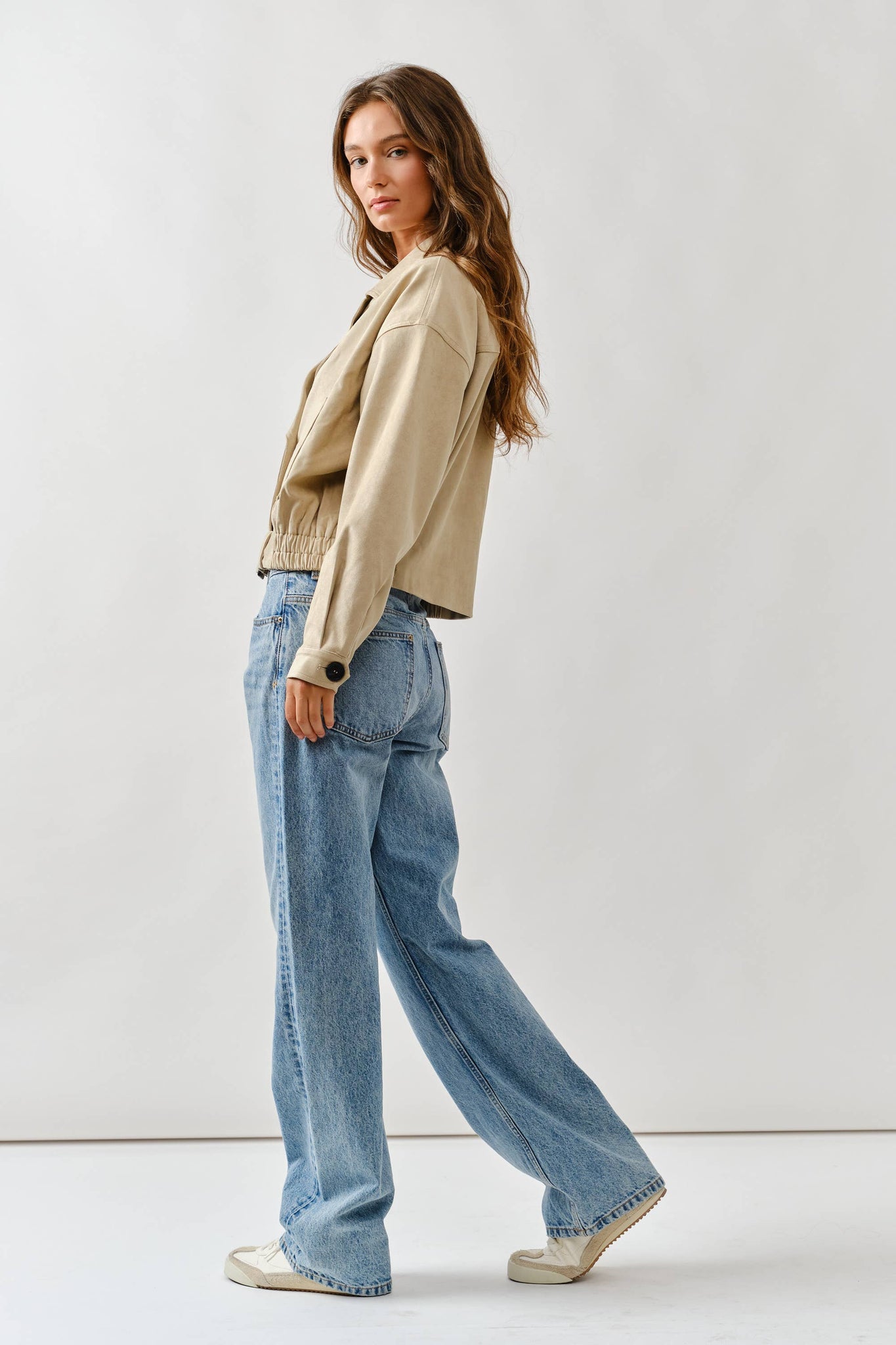 Trench Suede Half Jacket features a classic-fit silhouette with a waist-length cut, soft faux suede fabric, and interior lining. Designed with a double-breasted front, notched lapels, and welt side pockets. Adjustable waist drawstring allows for a customizable fit -Classic Fit -Half Coat -Faux Suede -Adjustable Waist Drawstring -Double-Breasted Front