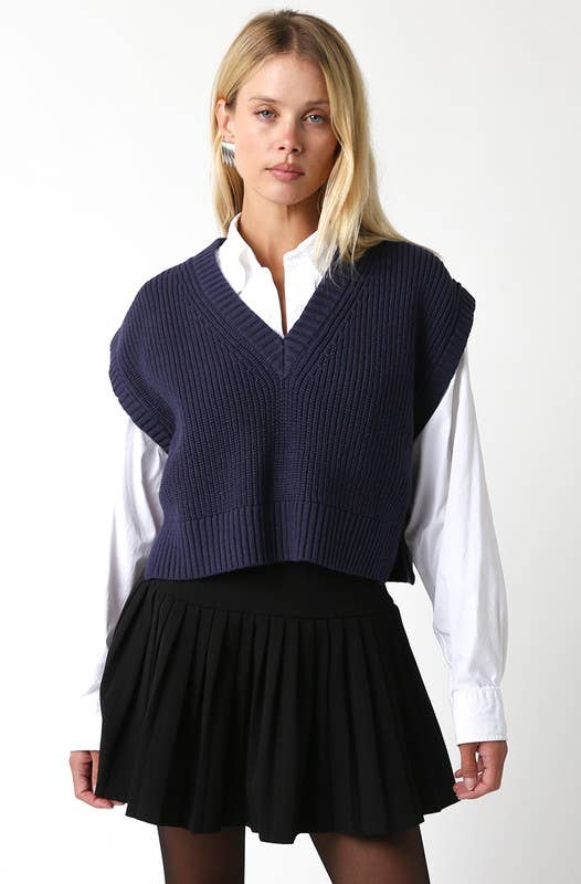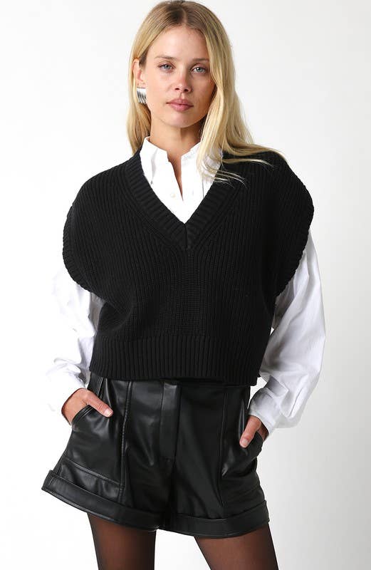The Nicole Sweater Vest is your go-to piece for effortless layering and modern style. This sleeveless knit features a flattering cropped silhouette that pairs perfectly with high-waisted bottoms, creating a polished, put-together look. The versatile design transitions seamlessly from casual days to elevated evenings, making it an essential addition to any wardrobe. Layer it over your favorite tees or wear it solo for a chic, contemporary vibe that never goes out of style.