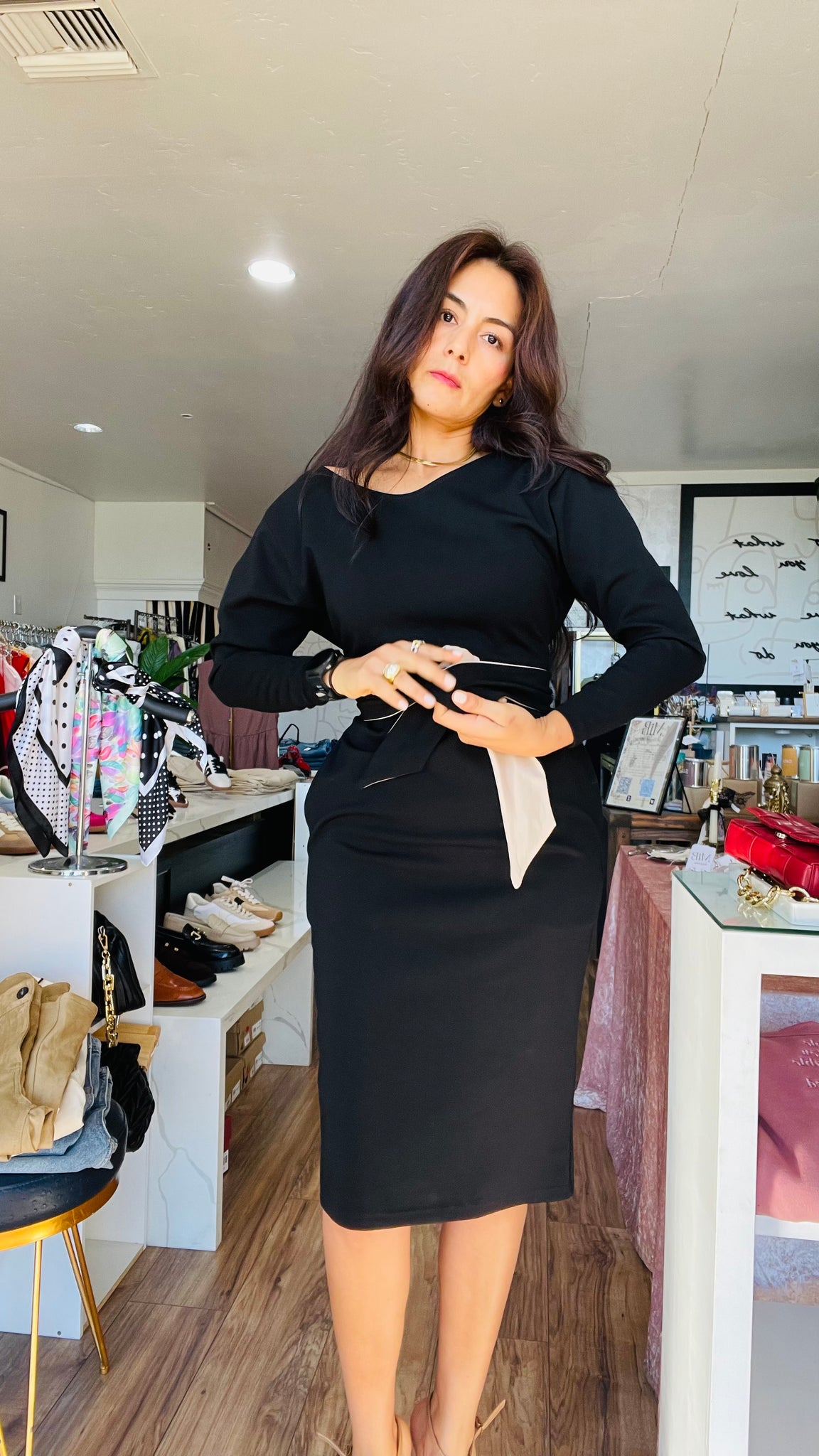 This is a shift dress with pockets, midi length, below the knee length, it features boat style neck that can also be worn off the shoulder. It has an attached self tie sash for a body hugging look. You Can tie it in different ways, forward single with a bow, wrap back then tie forward or wrap forward and tie back.